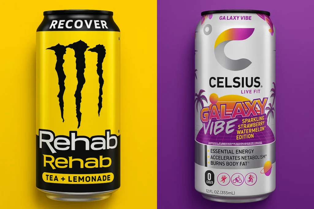 When it comes to energy drinks, Monster Rehab and Celsius occupy completely different niches. Monster Rehab is a hybrid energy–hydration beverage designed to refresh and restore, while Celsius focuses on performance, thermogenesis, and fat-burning.